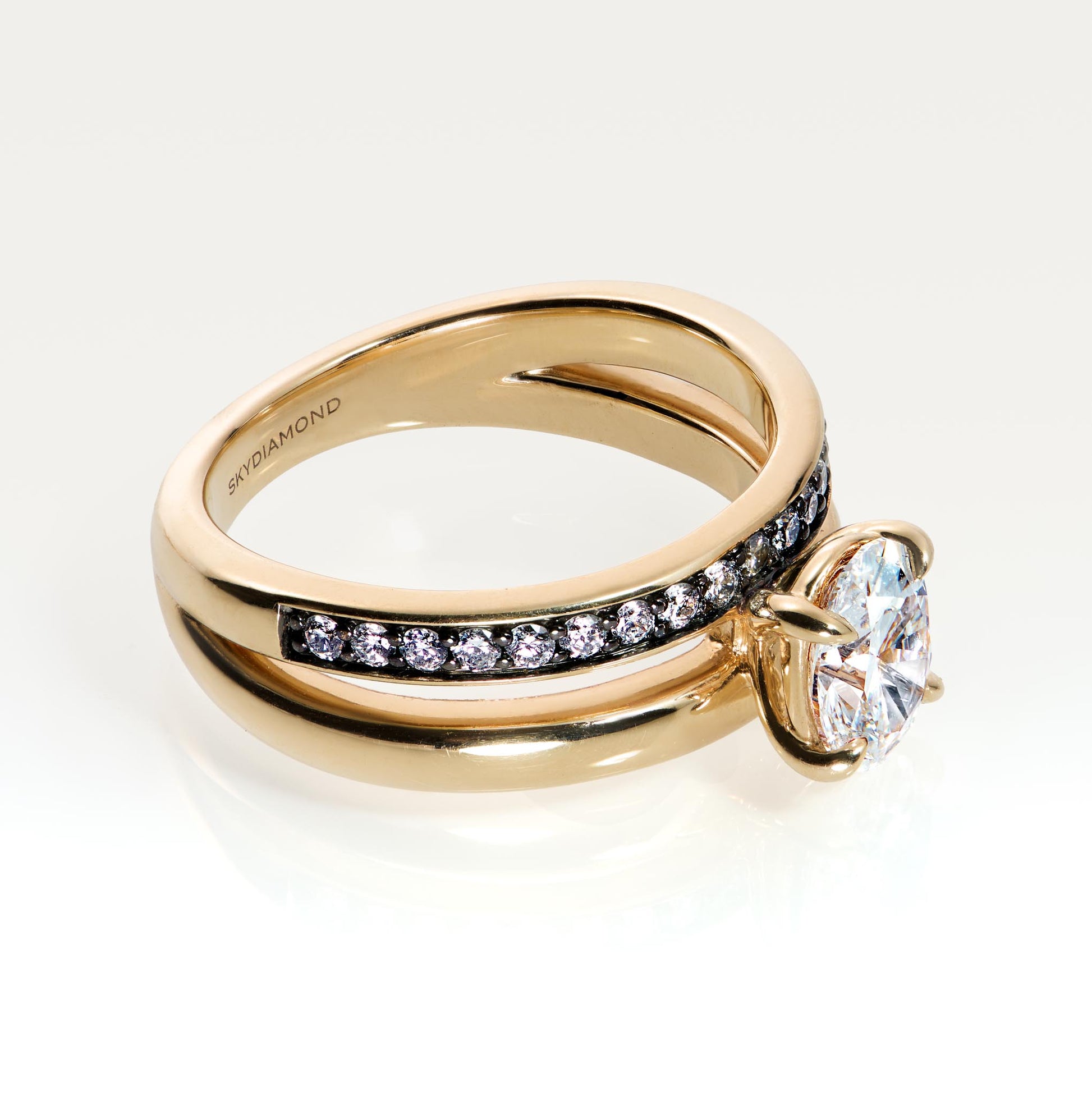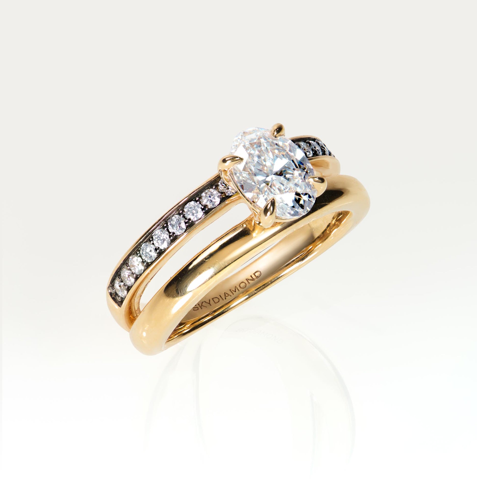 Reimagining timeless elegance, the Double Love Double Band Solitaire Ring showcases a luminous 1ct oval Skydiamond, held in a refined four-claw setting. Crafted from recycled 18ct yellow gold, this striking design features a distinctive double-band silhouette – one sleek and polished, the other adorned with grain-set Skydiamonds in deep black rhodium, creating a striking contrast. With a total lab-grown diamond weight of 1.18ct, this ring is a statement of modern sophistication, designed for those who embrace both strength and beauty in their jewellery.