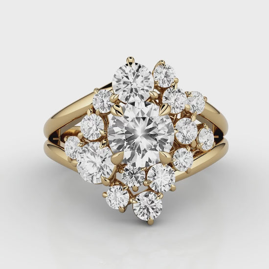 Sculptural and radiant, the Solaris Eclipse Ring in 14ct yellow gold features a striking 0.90ct centre Skydiamond surrounded by a halo of smaller round brilliant Skydiamonds.