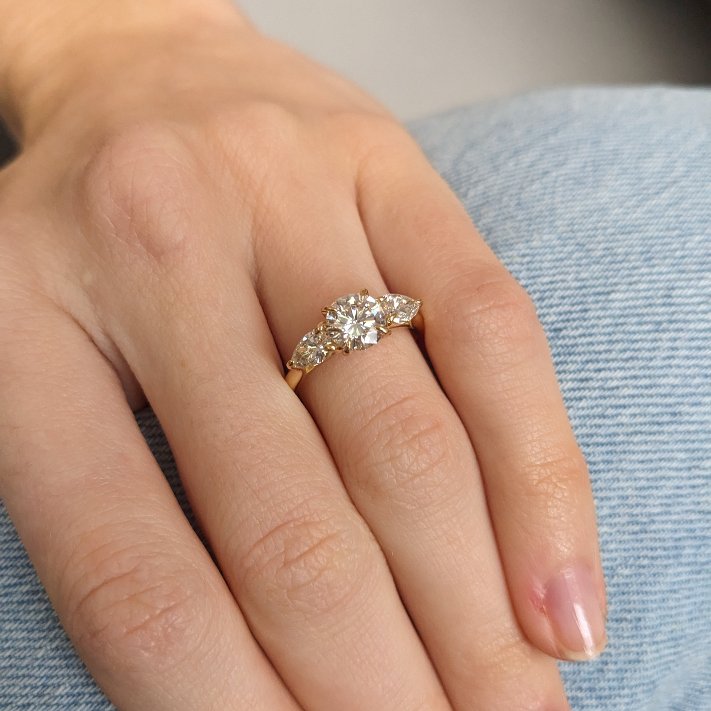 A celebration of modern elegance, ethical values and timeless romance. Our modern take on a Trilogy Engagement Ring, features a Round Brilliant Skydiamond, with a pear Skydiamond on either side. The centre stone is 1.04ct with a total carat weight of 1.64ct, claw set in recycled 18ct yellow gold.