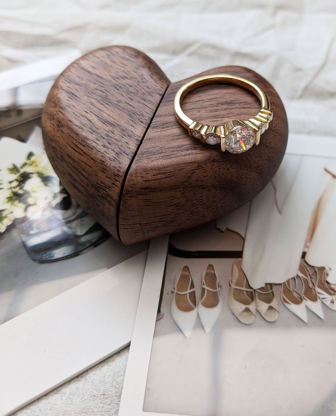 When you order an engagement ring, your piece comes nestled within our distinctive heart-shaped wooden box, a special presentation offering reserved for this timeless occasion. Like all aspects of our packaging, it’s chosen with lasting elegance and environmental responsibility in mind.