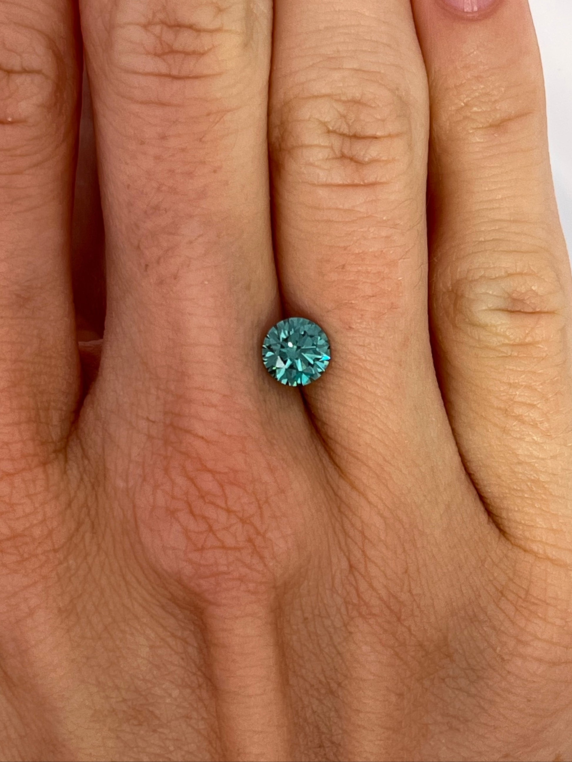 Subtly daring, this 1.02 ct teal round Skydiamond blends serene blues and greens in a mesmerizing balance. Its oceanic hue creates a quiet statement—perfect for someone who values sophistication and calm modernity.