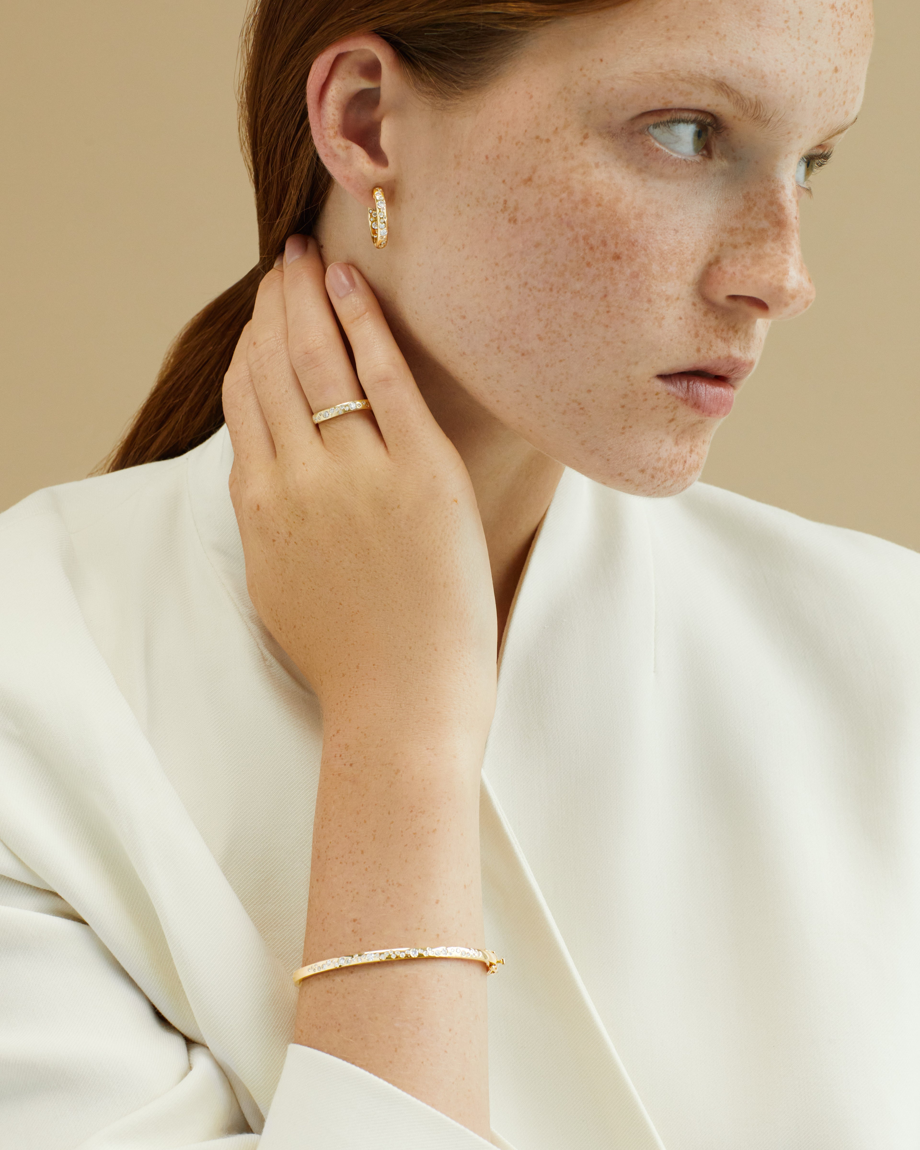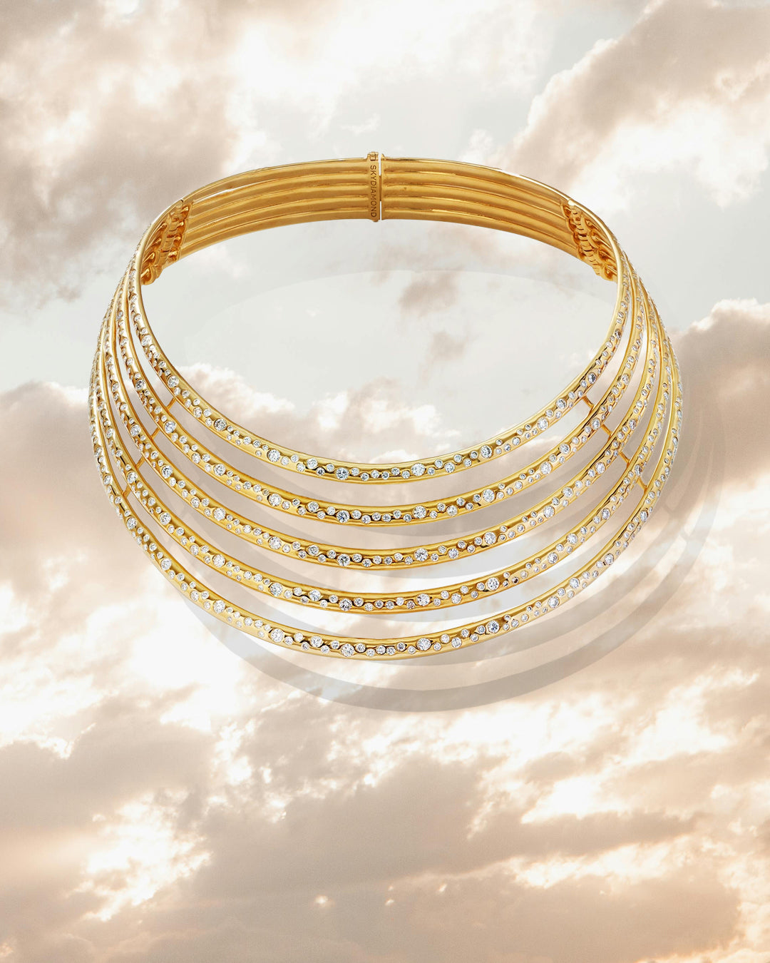 The Hera Layered Torque captures the celestial beauty of the goddess it’s named for. Inspired by the legend of Hera and the Milky Way, this sculptural design features five graduated bands, each set with Skydiamonds that shimmer like constellations in motion. Crafted in warm recycled 18ct gold, it balances bold architecture with emotive elegance. An extraordinary statement piece that radiates both power and grace.