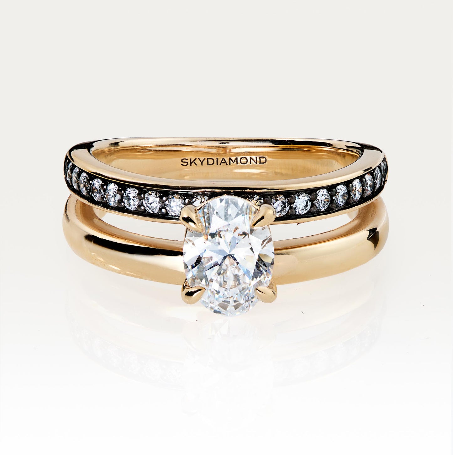 Reimagining timeless elegance, the Double Love Double Band Solitaire Ring showcases a luminous 1ct oval Skydiamond, held in a refined four-claw setting. Crafted from recycled 18ct yellow gold, this striking design features a distinctive double-band silhouette – one sleek and polished, the other adorned with grain-set Skydiamonds in deep black rhodium, creating a striking contrast. With a total lab-grown diamond weight of 1.18ct, this ring is a statement of modern sophistication, designed for those who embrace both strength and beauty in their jewellery.