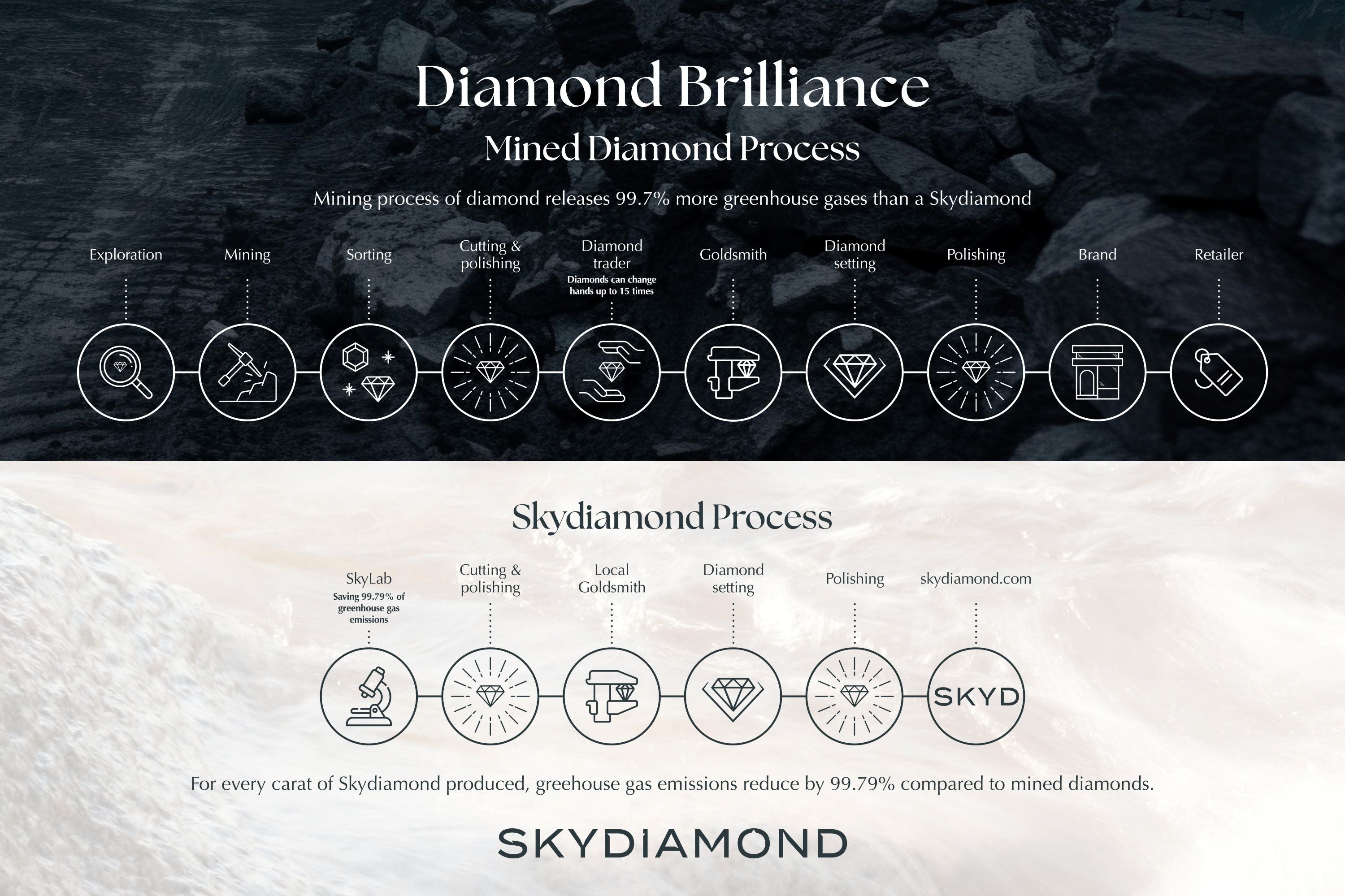 Because forever should begin with a purpose. There is nothing romantic about the destruction left behind by traditional diamond mining – its environmental impact is vast, and its supply chainoften murky and untraceable. A single mined diamond typically passes through more than 15 pairs of hands before reaching its final owner. In contrast, every Skydiamond is grown in a fully traceable, transparent process that is independently certified carbon negative by Imperial College London. This is a new kind of luxury: one that reflects not only personal style but personal values.
