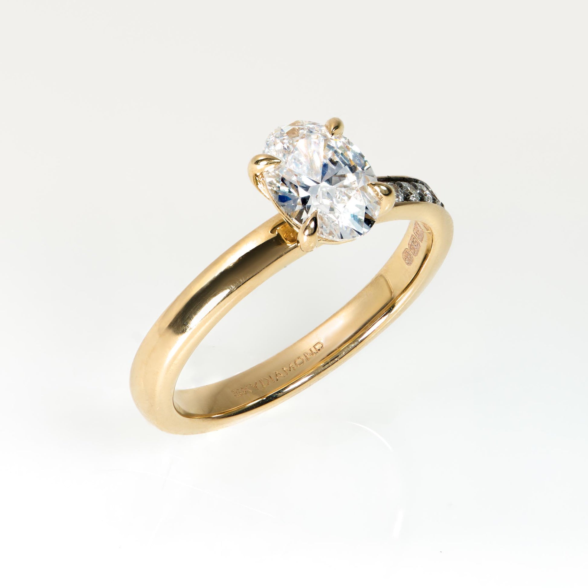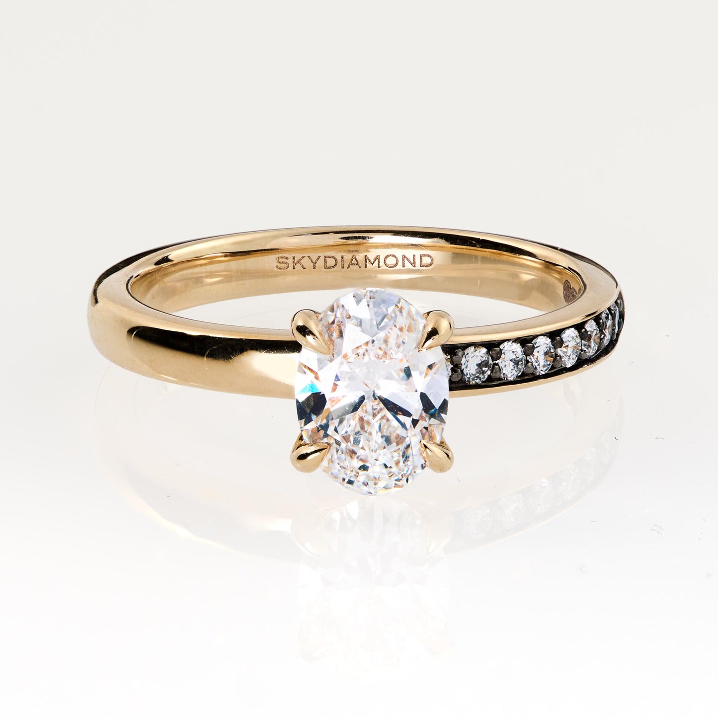 A striking balance of classic elegance and contemporary edge, the Double Love Solitaire Ring features a radiant 1.00ct HVS2 oval Skydiamond, secured in a refined four-claw setting. The warm 18ct recycled gold band is sleek and modern, with one side accented by a row of grain-set Skydiamonds and black rhodium, adding a dynamic contrast of texture, colour and light. A bold yet timeless design, this ring is crafted for those who appreciate sophistication with a touch of unexpected detail. With a total lab-grown diamond weight of 1.03ct, it’s a statement of refined luxury and conscious craftsmanship.