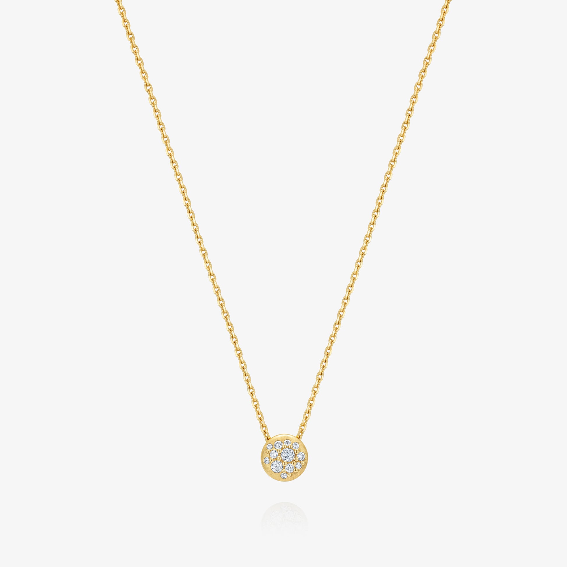 Inspired by the soft glow of the moon on a winter’s night, the pendant captures a quiet kind of radiance. Each brushed gold disc is scattered with Skydiamonds — a constellation of light that shimmers gently as you move. Set on a diamond-cut trace chain with a brushed gold disc.