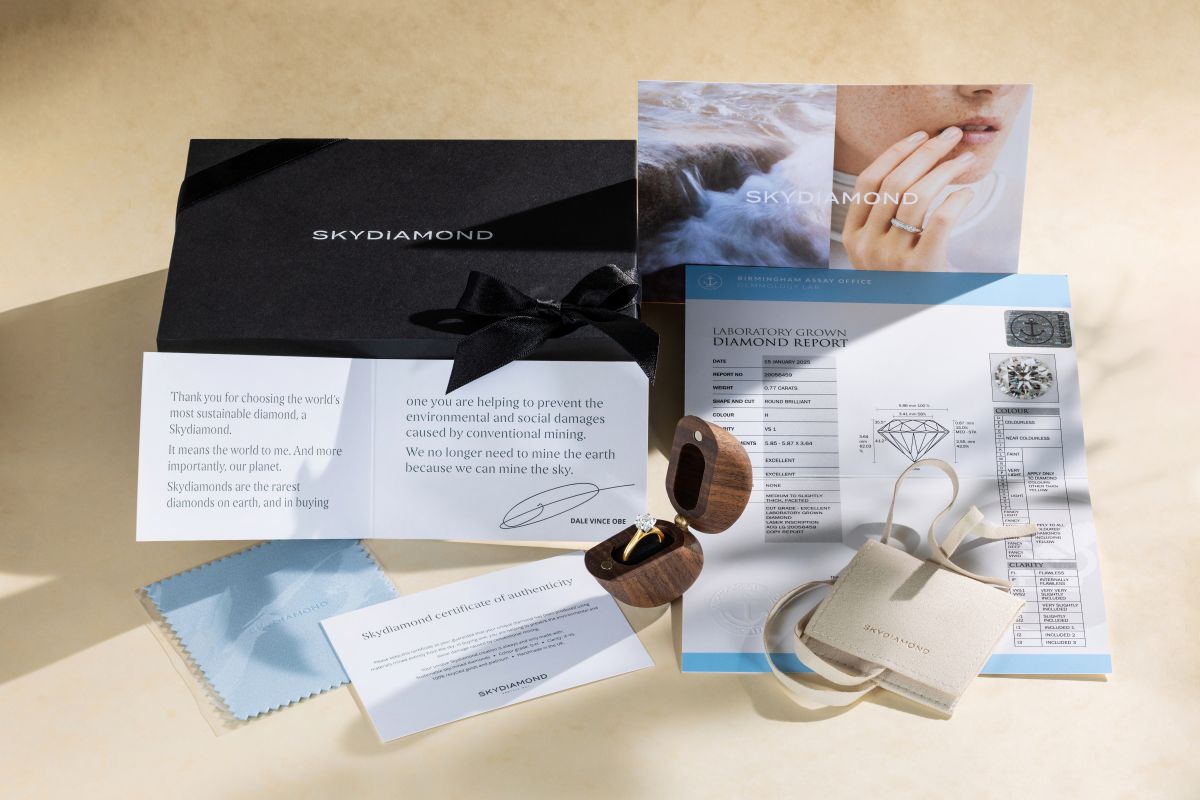 All orders are secured in a soft pouch made from recycled textiles. Each piece has an Skydiamond jewellery authentication card and all diamonds over 0.5carats come with an official diamond certification.