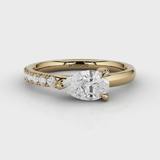 At the centre of the Stilla Solitaire Ring is a 0.64ct Pear Skydiamond making this a truly unique piece set in recycled yellow gold, with pave man-made diamonds on part of the band. A treasure of timeless love and unwavering commitment.