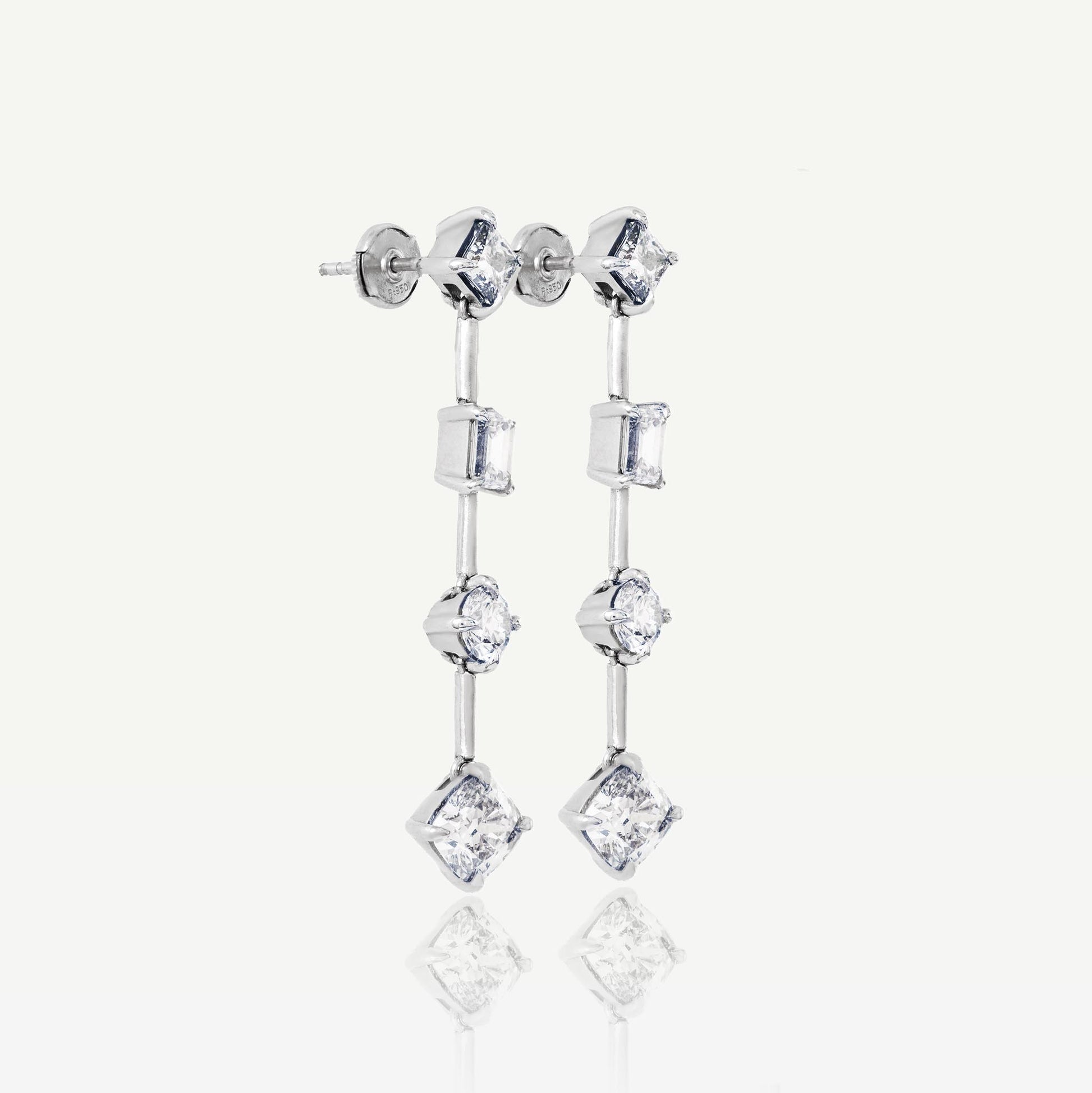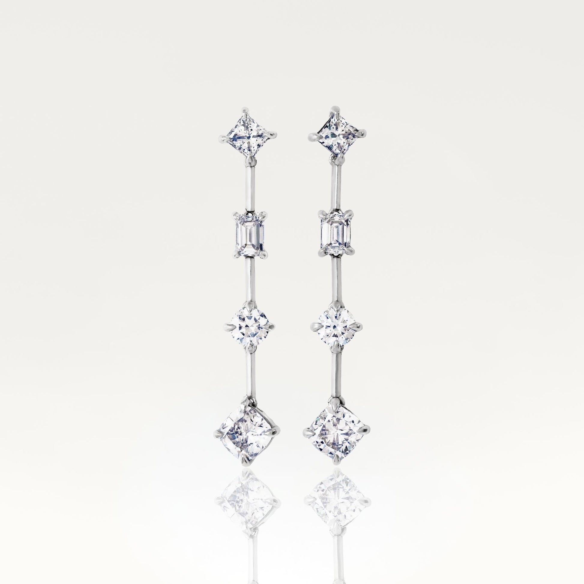 Inspired by the unpredictable elegance of lightning in motion, the Stiletto Earrings are sharp, sculptural, and unapologetically bold. Each earring is forged from platinum and set with a melange of Liquid Silver Skydiamond custom cuts — including angular Rocket and Volt shapes, contrasted by classic brilliants and clean-edged emeralds. The result is a tension of geometry and flow: deliberate yet untamed. Dropping from the ear like shards of light, the earrings strike a perfect balance between edge and refinement, with a total diamond weight of 5.61cts.